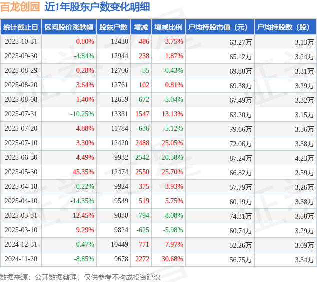 从股价来看,2025年9月30日至2025年10月31日,百龙创园区间涨幅为0.8%,在此期间股东户数增加486.0户,增幅为3.75%。