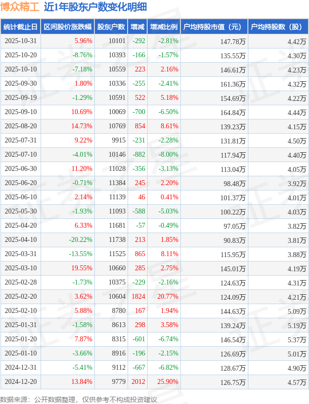 从股价来看,2025年10月20日至2025年10月31日,博众精工区间涨幅为5.96%,在此期间股东户数减少292.0户,减幅为2.81%。