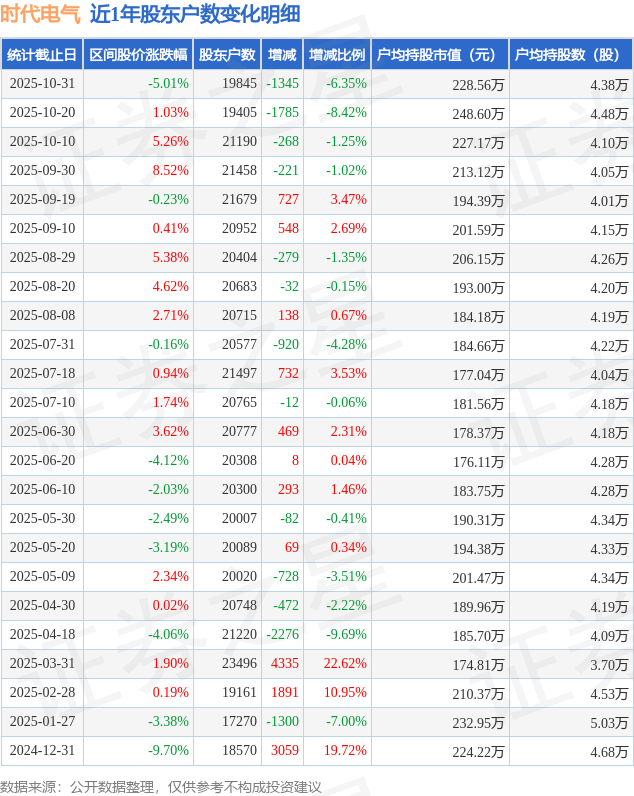 从股价来看,2025年10月10日至2025年10月31日,时代电气区间跌幅为5.01%,在此期间股东户数减少1345.0户,减幅为6.35%。