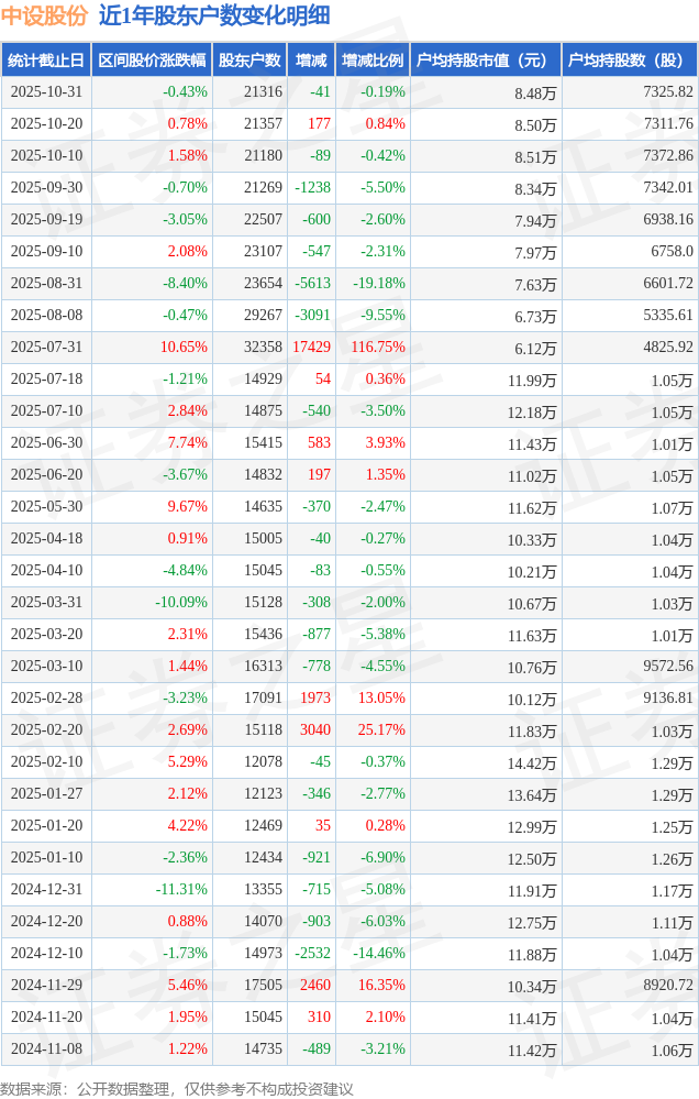 从股价来看,2025年10月20日至2025年10月31日,中设股份区间跌幅为0.43%,在此期间股东户数减少41.0户,减幅为0.19%。
