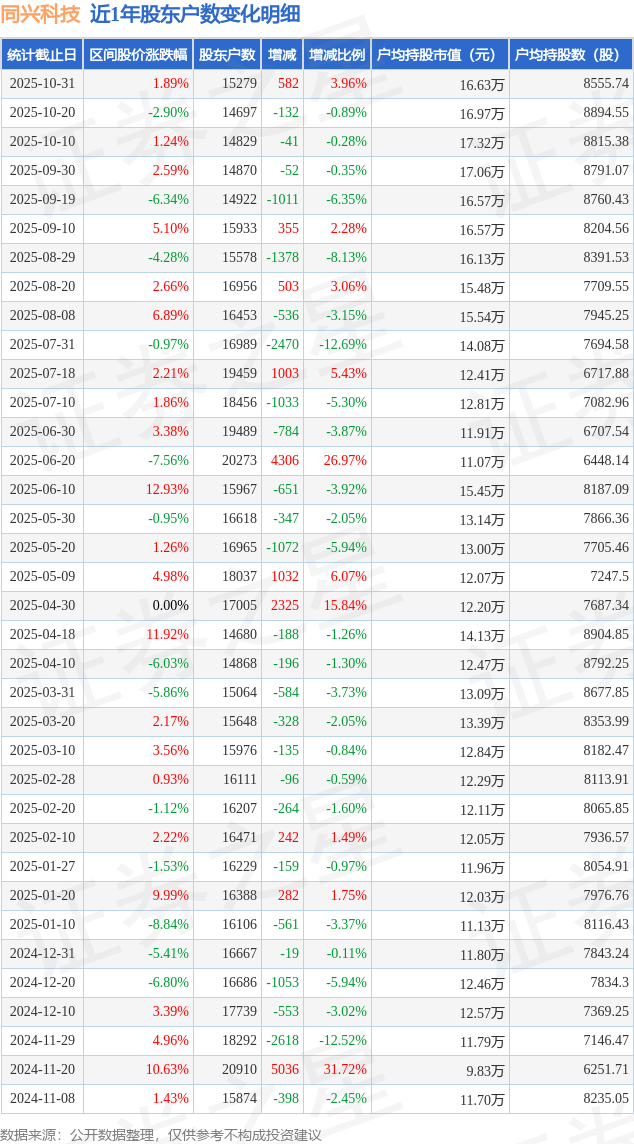 从股价来看,2025年10月20日至2025年10月31日,同兴科技区间涨幅为1.89%,在此期间股东户数增加582.0户,增幅为3.96%。