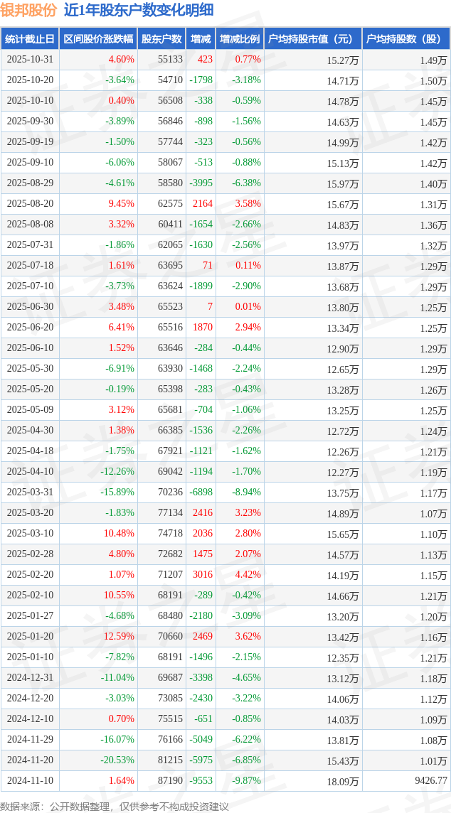 从股价来看,2025年10月20日至2025年10月31日,银邦股份区间涨幅为4.6%,在此期间股东户数增加423.0户,增幅为0.77%。