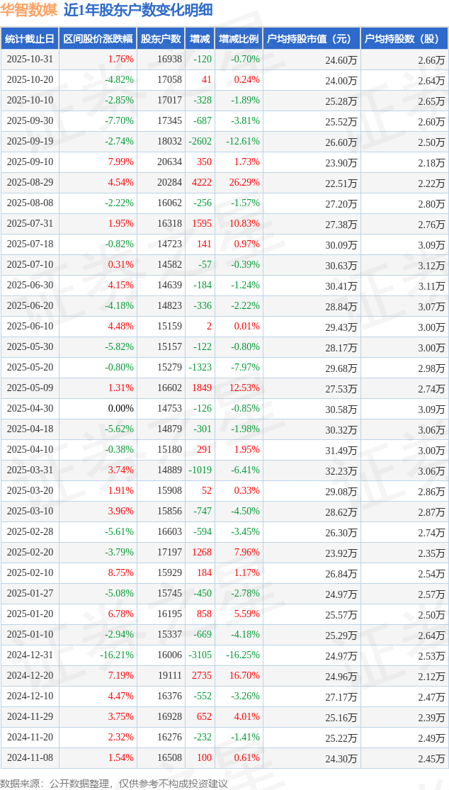从股价来看,2025年10月20日至2025年10月31日,华智数媒区间涨幅为1.76%,在此期间股东户数减少120.0户,减幅为0.7%。