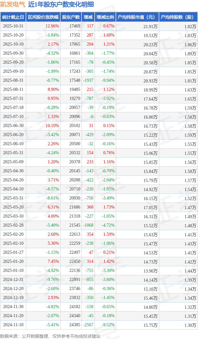 从股价来看,2025年10月20日至2025年10月31日,凯发电气区间涨幅为12.96%,在此期间股东户数增加117.0户,增幅为0.67%。