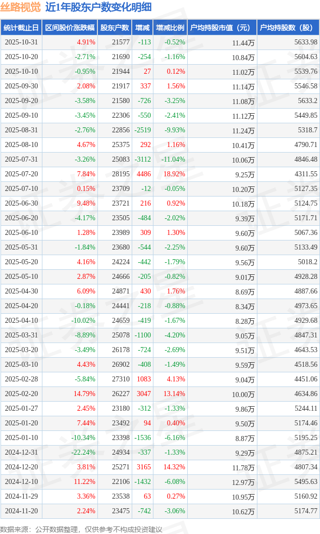 从股价来看,2025年10月20日至2025年10月31日,丝路视觉区间涨幅为4.91%,在此期间股东户数减少113.0户,减幅为0.52%。