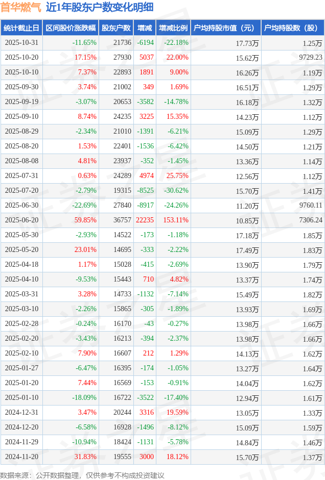 从股价来看,2025年10月20日至2025年10月31日,首华燃气区间跌幅为11.65%,在此期间股东户数减少6194.0户,减幅为22.18%。