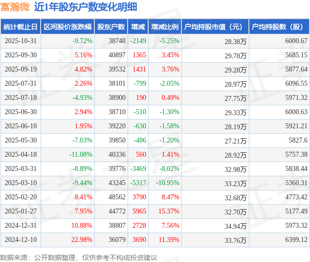 从股价来看,2025年9月30日至2025年10月31日,富瀚微区间跌幅为9.72%,在此期间股东户数减少2149.0户,减幅为5.25%。