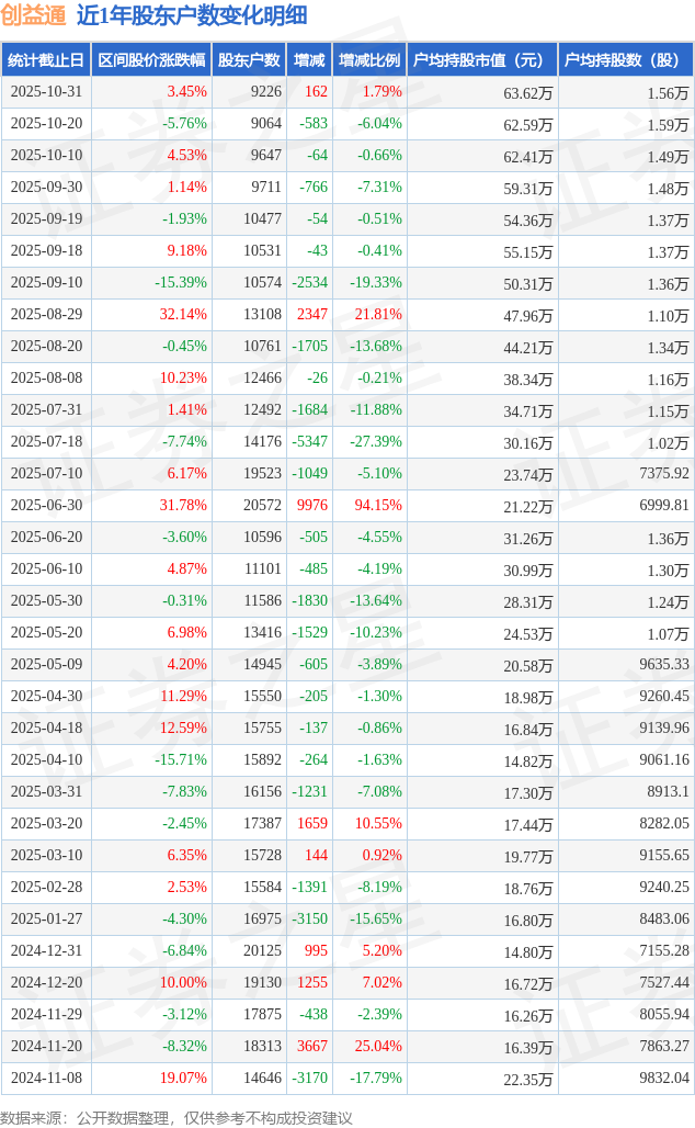 从股价来看,2025年10月20日至2025年10月31日,创益通区间涨幅为3.45%,在此期间股东户数增加162.0户,增幅为1.79%。