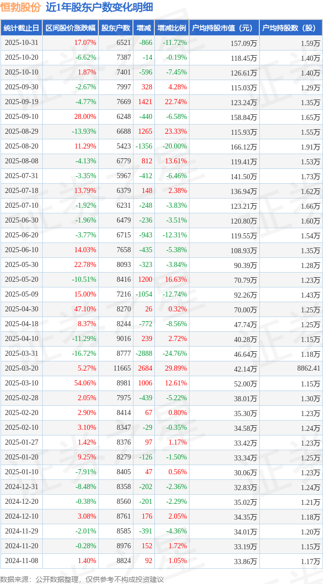 从股价来看,2025年10月20日至2025年10月31日,恒勃股份区间涨幅为17.07%,在此期间股东户数减少866.0户,减幅为11.72%。