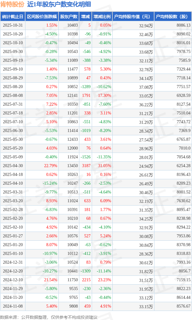 从股价来看,2025年10月20日至2025年10月31日,肯特股份区间涨幅为1.55%,在此期间股东户数增加5.0户,增幅为0.05%。