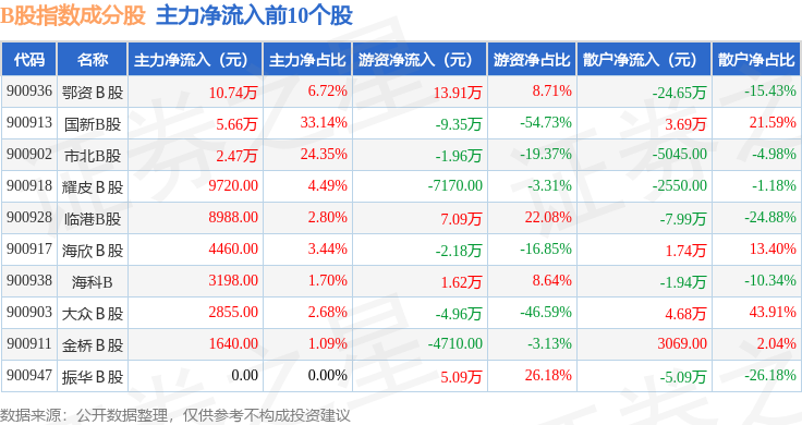 资金流向方面,B股指数(000003)成份股当日主力资金净流出合计29.85万元,游资资金净流出合计117.77万元,散户资金净流入合计147.62万元。成份股资金流向详情见下表: