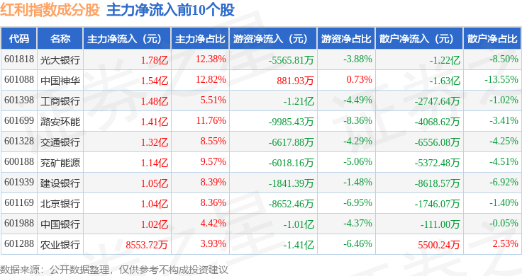 资金流向方面,红利指数(000015)成份股当日主力资金净流入合计18.02亿元,游资资金净流出合计11.35亿元,散户资金净流出合计6.67亿元。成份股资金流向详情见下表: