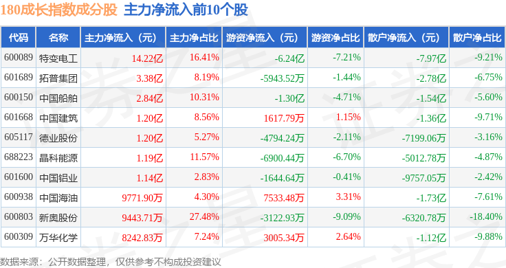 资金流向方面,180成长(000028)指数成份股当日主力资金净流出合计47.96亿元,游资资金净流入合计14.8亿元,散户资金净流入合计33.17亿元。成份股资金流向详情见下表: