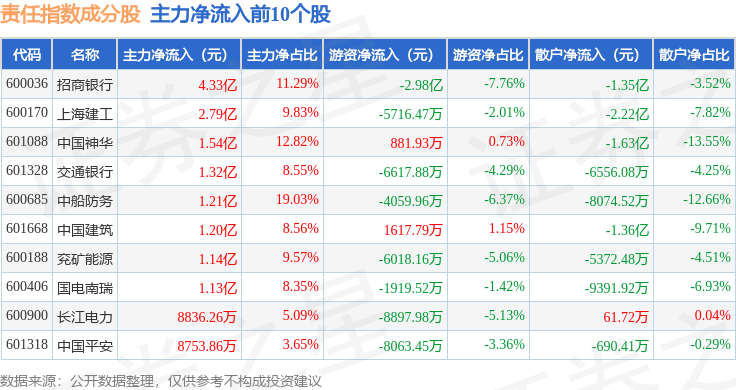 资金流向方面,责任指数(000048)成份股当日主力资金净流入合计6.07亿元,游资资金净流出合计3.51亿元,散户资金净流出合计2.56亿元。成份股资金流向详情见下表: