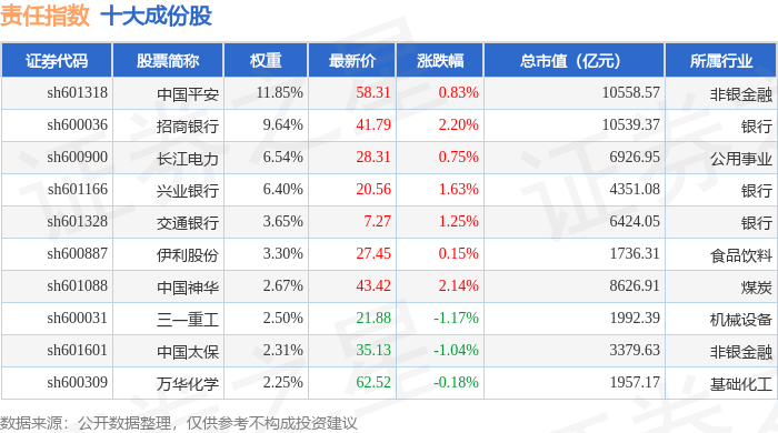 证券之星消息,11月3日,责任指数(000048)报收于1446.16点,涨0.41%,成交730.57亿元,换手率0.79%。当日该指数成份股中,上涨的有54家,上海建工以6.38%的涨幅领涨,下跌的有42家,思维列控以9.87%的跌幅领跌。