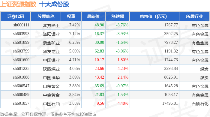 证券之星消息,11月3日,上证资源(000068)指数报收于3830.37点,跌0.16%,成交693.29亿元,换手率0.92%。当日该指数成份股中,上涨的有28家,中煤能源以5.45%的涨幅领涨,下跌的有19家,广晟有色以4.92%的跌幅领跌。