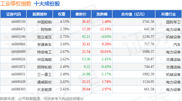 证券之星消息,11月3日,工业等权(000072)指数报收于3069.81点,涨1.38%,成交601.74亿元,换手率0.94%。当日该指数成份股中,上涨的有33家,阿特斯以12.19%的涨幅领涨,下跌的有13家,恒立液压以4.03%的跌幅领跌。