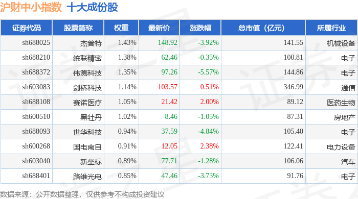 证券之星消息,11月3日,沪财中小(000091)指数报收于14415.94点,涨0.07%,成交525.18亿元,换手率2.58%。当日该指数成份股中,上涨的有111家,国机通用以10.02%的涨幅领涨,下跌的有81家,华锡有色以6.14%的跌幅领跌。