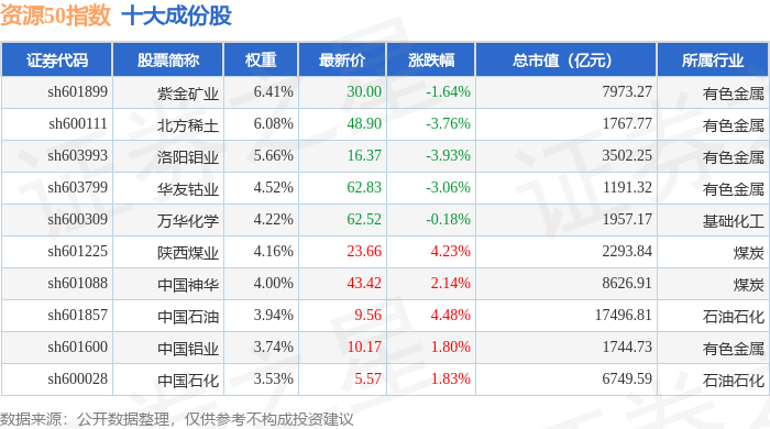 资源50(000092)指数十大成份股详情如下: