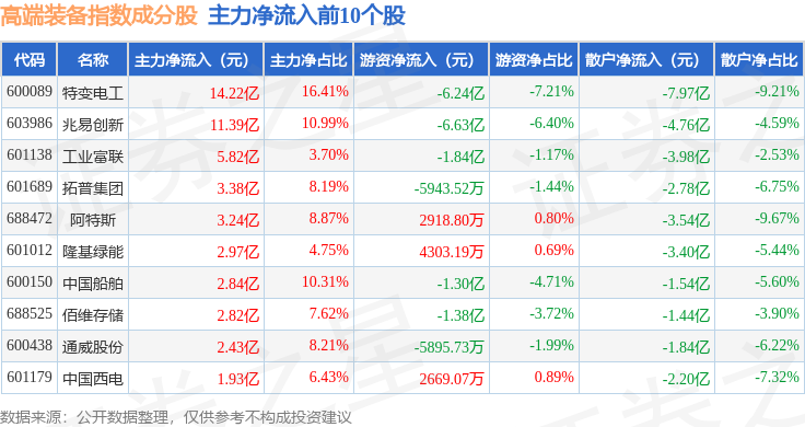 资金流向方面,高端装备(000097)指数成份股当日主力资金净流入合计11.0亿元,游资资金净流出合计2207.55万元,散户资金净流出合计10.77亿元。成份股资金流向详情见下表: