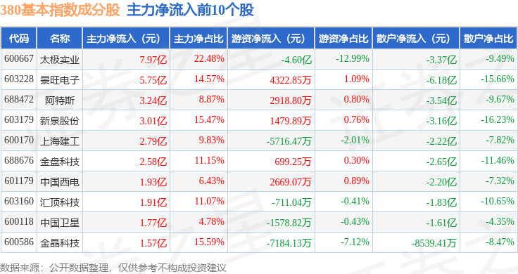 资金流向方面,380基本(000128)指数成份股当日主力资金净流出合计11.7亿元,游资资金净流入合计10.9亿元,散户资金净流入合计8071.09万元。成份股资金流向详情见下表: