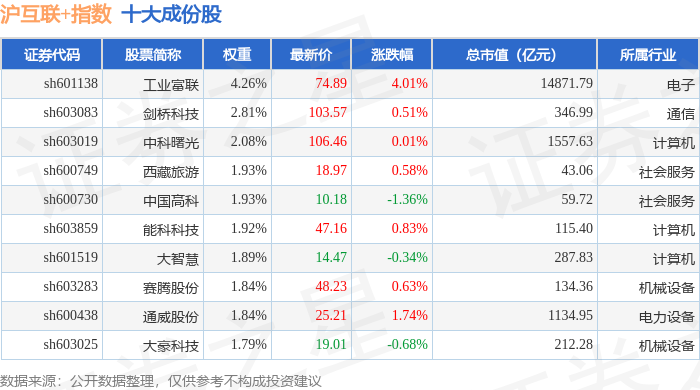 证券之星消息,11月3日,沪互联+(000162)指数报收于3743.32点,涨0.87%,成交593.23亿元,换手率1.16%。当日该指数成份股中,上涨的有49家,信捷电气以7.61%的涨幅领涨,下跌的有20家,步科股份以5.16%的跌幅领跌。