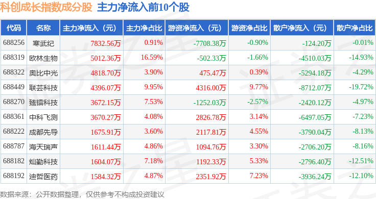 资金流向方面,科创成长(000690)指数成份股当日主力资金净流出合计8.38亿元,游资资金净流入合计7.59亿元,散户资金净流入合计7871.42万元。成份股资金流向详情见下表: