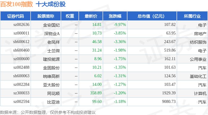 证券之星消息,11月3日,百发100(000851)指数报收于20270.3点,涨0.04%,成交596.76亿元,换手率1.79%。当日该指数成份股中,上涨的有68家,三木集团以10.05%的涨幅领涨,下跌的有18家,金安国纪以9.97%的跌幅领跌。