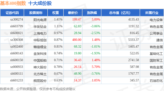 证券之星消息,11月3日,基本400(000966)指数报收于8883.85点,涨0.31%,成交3791.04亿元,换手率1.81%。当日该指数成份股中,上涨的有243家,阿特斯以12.19%的涨幅领涨,下跌的有150家,中材科技以8.51%的跌幅领跌。