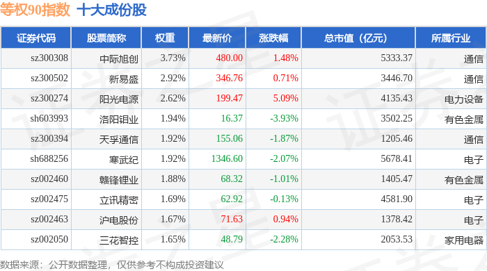 证券之星消息,11月3日,等权90(000971)指数报收于3375.27点,涨0.14%,成交3103.76亿元,换手率0.46%。当日该指数成份股中,上涨的有50家,阳光电源以5.09%的涨幅领涨,下跌的有37家,洛阳钼业以3.93%的跌幅领跌。