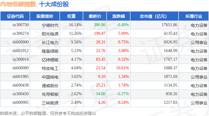 证券之星消息,11月3日,内地低碳(000977)指数报收于2225.88点,涨1.46%,成交1173.63亿元,换手率1.54%。当日该指数成份股中,上涨的有36家,阿特斯以12.19%的涨幅领涨,下跌的有14家,先导智能以6.37%的跌幅领跌。