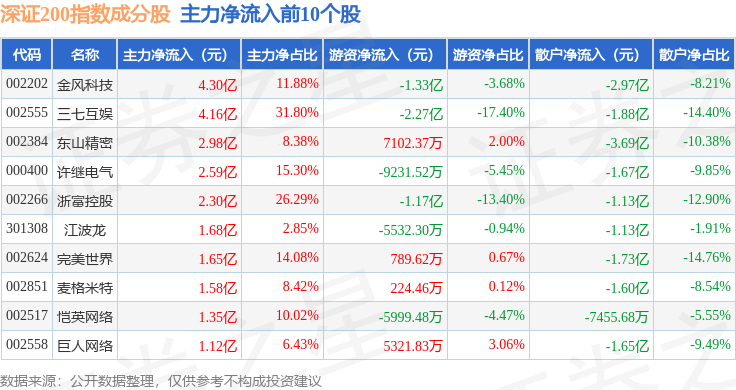 资金流向方面,深证200(399009)指数成份股当日主力资金净流出合计39.22亿元,游资资金净流入合计9.35亿元,散户资金净流入合计29.87亿元。成份股资金流向详情见下表: