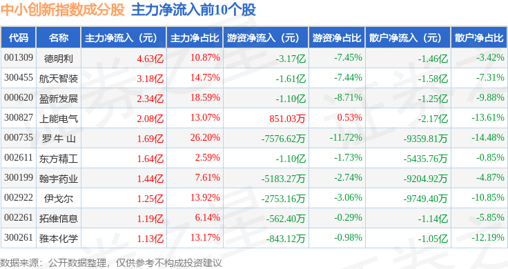 资金流向方面,中小创新(399015)指数成份股当日主力资金净流出合计16.03亿元,游资资金净流出合计3.3亿元,散户资金净流入合计19.33亿元。成份股资金流向详情见下表: