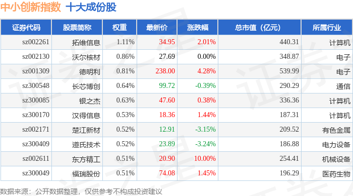 证券之星消息,11月3日,中小创新(399015)指数报收于2939.21点,涨0.7%,成交1931.39亿元,换手率3.29%。当日该指数成份股中,上涨的有340家,航天智装以19.98%的涨幅领涨,下跌的有150家,新莱应材以8.16%的跌幅领跌。