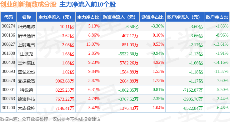 资金流向方面,创业创新(399018)指数成份股当日主力资金净流出合计21.71亿元,游资资金净流入合计9.75亿元,散户资金净流入合计11.96亿元。成份股资金流向详情见下表:
