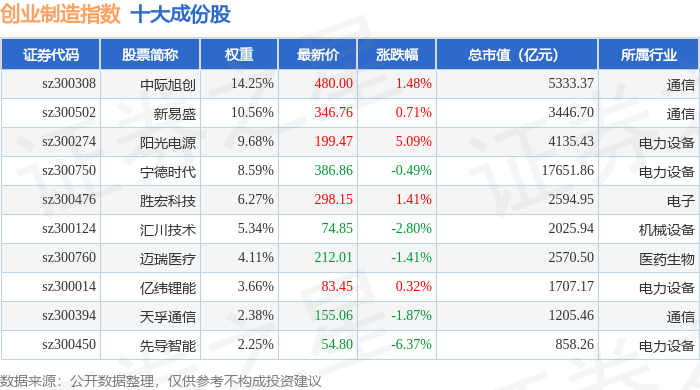 证券之星消息,11月3日,创业制造(399261)指数报收于6070.73点,涨0.49%,成交1507.82亿元,换手率3.24%。当日该指数成份股中,上涨的有26家,天华新能以12.0%的涨幅领涨,下跌的有24家,金力永磁以6.97%的跌幅领跌。