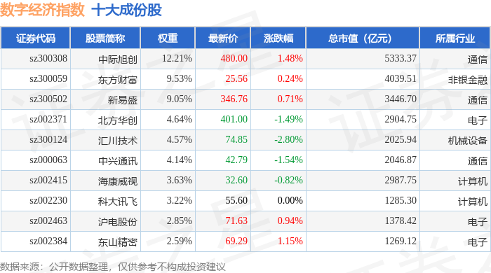 数字经济(399262)指数十大成份股详情如下: