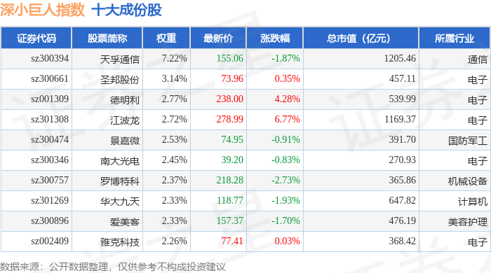 证券之星消息,11月3日,深小巨人(399268)指数报收于1995.89点,跌0.15%,成交583.04亿元,换手率3.83%。当日该指数成份股中,上涨的有53家,美瑞新材以19.99%的涨幅领涨,下跌的有45家,斯迪克以7.07%的跌幅领跌。