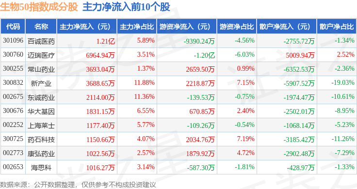资金流向方面,生物50(399280)指数成份股当日主力资金净流出合计3794.76万元,游资资金净流入合计3131.98万元,散户资金净流入合计662.78万元。成份股资金流向详情见下表: