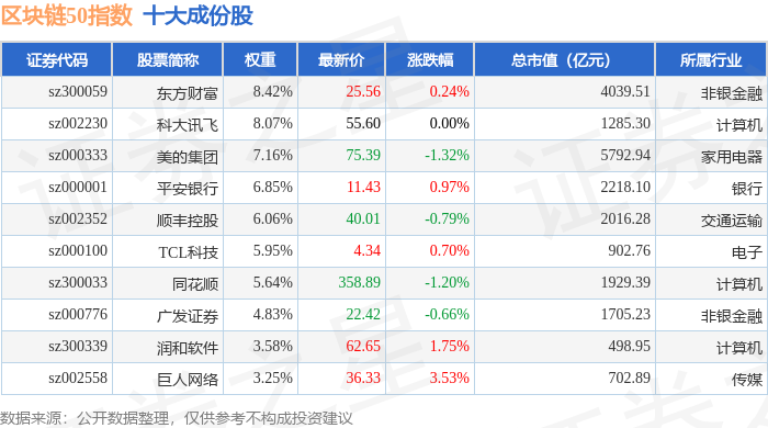 区块链50(399286)指数十大成份股详情如下: