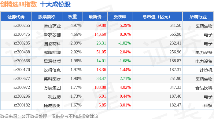 证券之星消息,11月3日,创精选88(399291)指数报收于4496.5点,涨1.03%,成交538.74亿元,换手率3.65%。当日该指数成份股中,上涨的有48家,香农芯创以8.36%的涨幅领涨,下跌的有39家,新莱应材以8.16%的跌幅领跌。