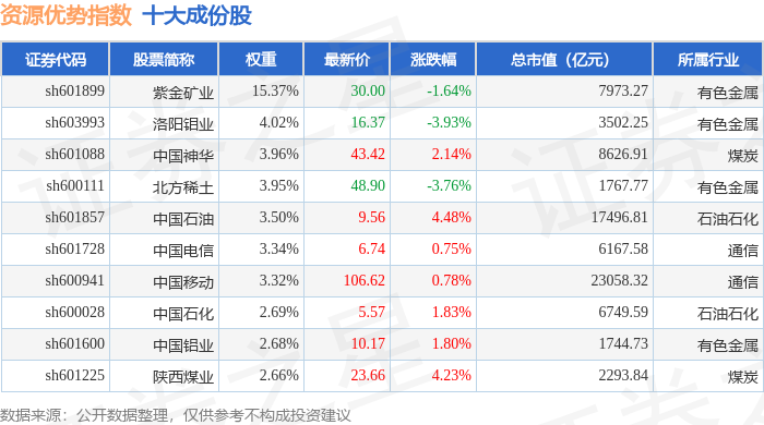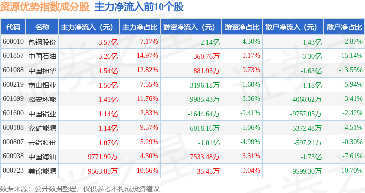 资金流向方面,资源优势(399319)指数成份股当日主力资金净流出合计36.1亿元,游资资金净流出合计3.76亿元,散户资金净流入合计39.86亿元。成份股资金流向详情见下表: