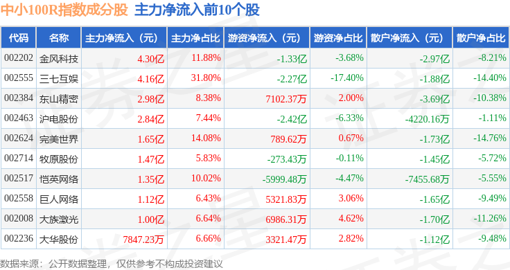 资金流向方面,中小100R(399333)指数成份股当日主力资金净流出合计34.55亿元,游资资金净流出合计8826.22万元,散户资金净流入合计35.44亿元。成份股资金流向详情见下表:
