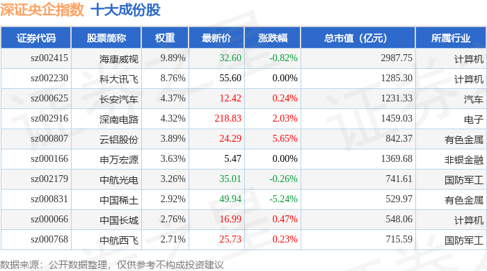 证券之星消息,11月3日,深证央企(399335)指数报收于4326.33点,跌0.06%,成交425.48亿元,换手率0.93%。当日该指数成份股中,上涨的有26家,云铝股份以5.65%的涨幅领涨,下跌的有20家,中材科技以8.51%的跌幅领跌。