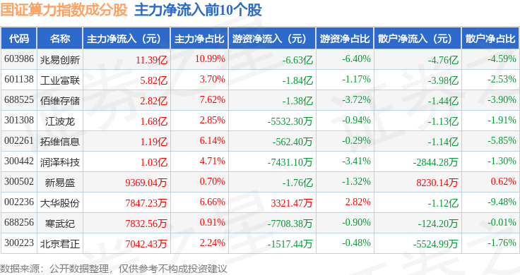 资金流向方面,国证算力(399363)指数成份股当日主力资金净流出合计21.91亿元,游资资金净流入合计1.33亿元,散户资金净流入合计20.57亿元。成份股资金流向详情见下表: