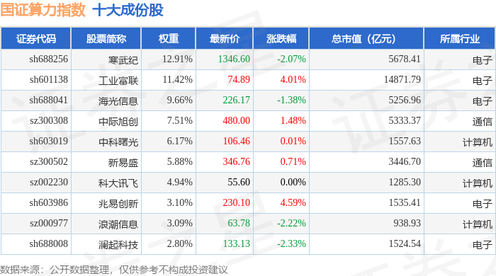 国证算力(399363)指数十大成份股详情如下: