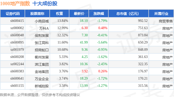 证券之星消息,11月3日,1000地产(399367)指数报收于2811.47点,跌1.13%,成交82.12亿元,换手率0.82%。当日该指数成份股中,上涨的有7家,上海临港以3.27%的涨幅领涨,下跌的有10家,张江高科以5.64%的跌幅领跌。