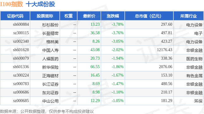 I100(399415)指数十大成份股详情如下: