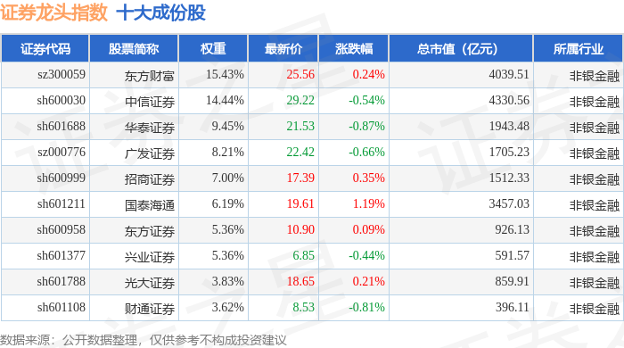 证券之星消息,11月3日,证券龙头(399437)指数报收于6972.12点,跌0.21%,成交281.57亿元,换手率0.96%。当日该指数成份股中,上涨的有8家,国泰海通以1.19%的涨幅领涨,下跌的有20家,长江证券以1.47%的跌幅领跌。