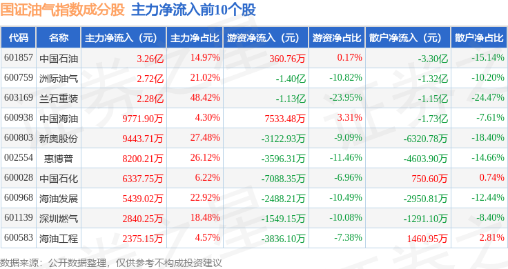 资金流向方面,国证油气(399439)指数成份股当日主力资金净流入合计8.68亿元,游资资金净流出合计3.64亿元,散户资金净流出合计5.04亿元。成份股资金流向详情见下表: